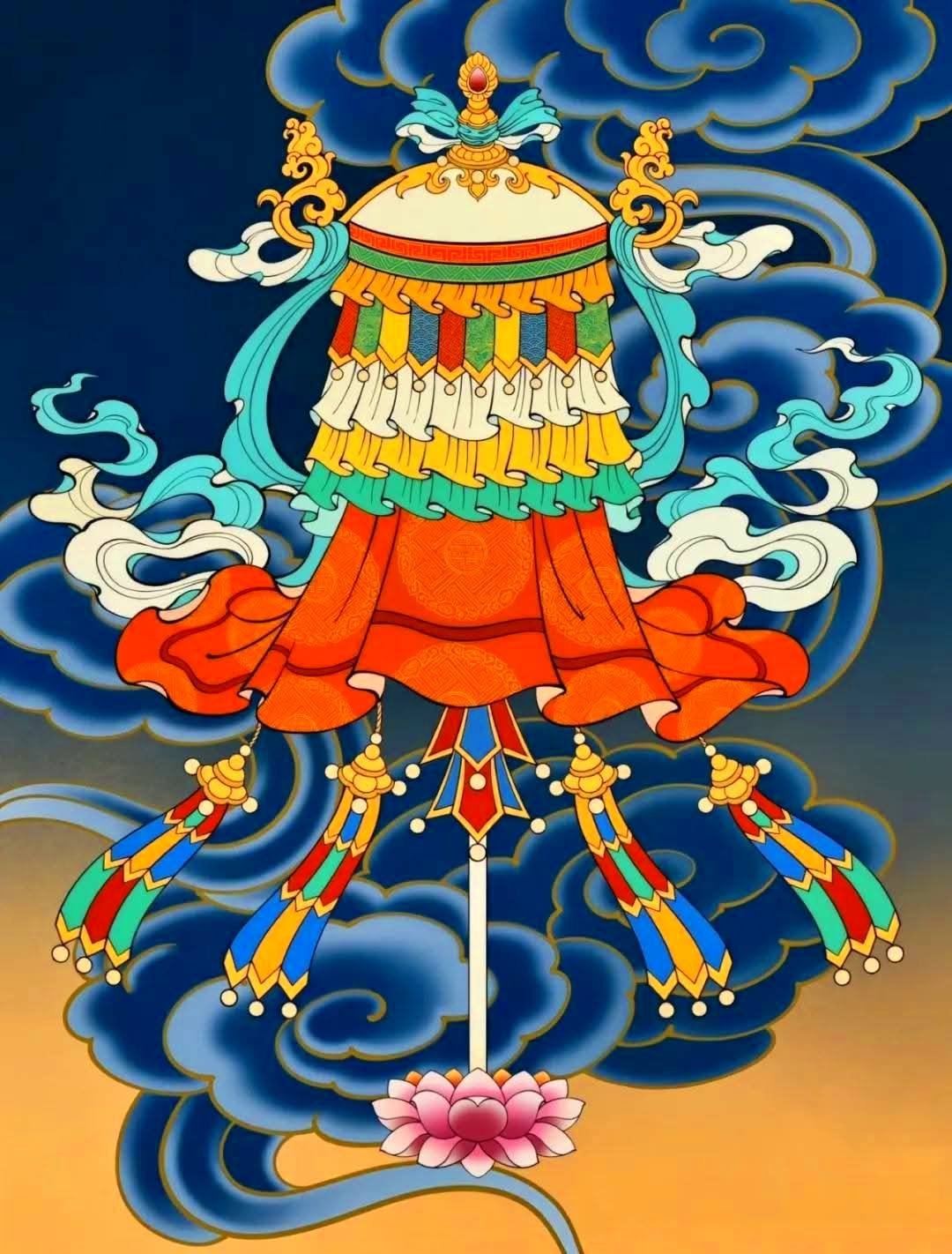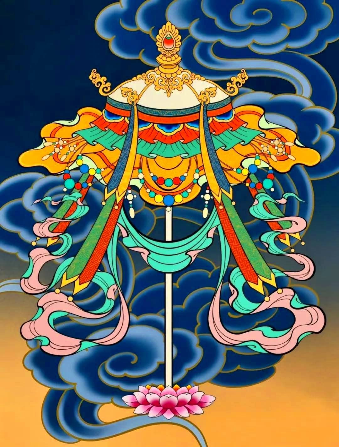 རིན་ཆེན་གདུགས་མཆོག གདུགས་དཀར་པོ་གསེར་གྱི་ཡུ་བ་ཅན་དར་སྣ་ཚོགས་ཀྱི་འཕུར་ལྡིང་གཡོ་བ་རིན་པོ་ཆེའི་ཏོག་གིས་མཛེས་པ་དབུ་ལ་ཕུལ་བས་རང་གཞན་སེམས་ཅན་ཐམས་ཅད་ཉོན་མོངས་པའི་ཚ་གདུང་ལས་སྐྱོབ་པར་ཤོག་ཅིག