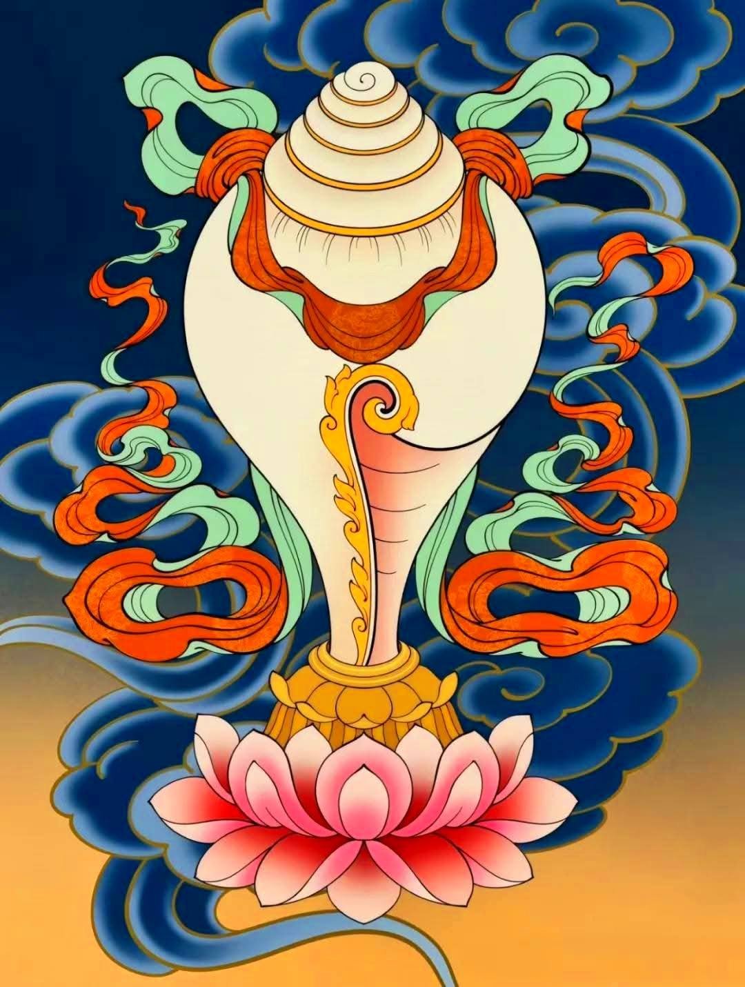 སྙན་གྲགས་དུང་། བྱང་ཆུབ་སེམས་དཔའ་གཞན་དོན་དུ་སྐྱེ་བ་བཟུང་བའི་བཀྲ་ཤིས་པའི་ཆོས་དུང་གཡས་སུ་འཁྱིལ་པ་ཚེམས་ལ་ཕུལ་བས་ཚེམས་ཕྲེང་བཞི་བཅུ་མངོན་ཞིང་རོ་བྲོ་བའི་མཆོག་ཐོབ་ཅིང་དུང་གི་ཚེམས་བར་ནས་དམ་པའི་ཆོས་ཀྱི་སྒྲ་དབྱངས་སྒྲོགས་པ་དང་།