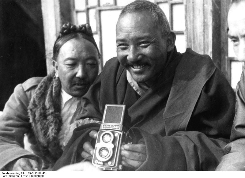 ལྷ་ས། སྐྱིད་སྦུག་དང་། སྨོན་གྲོང་། ཕྱི་ལོ། 1938 Lhasa. Kyibu watches Möndro taking photos. པར་པ། Ernst Schäfer.