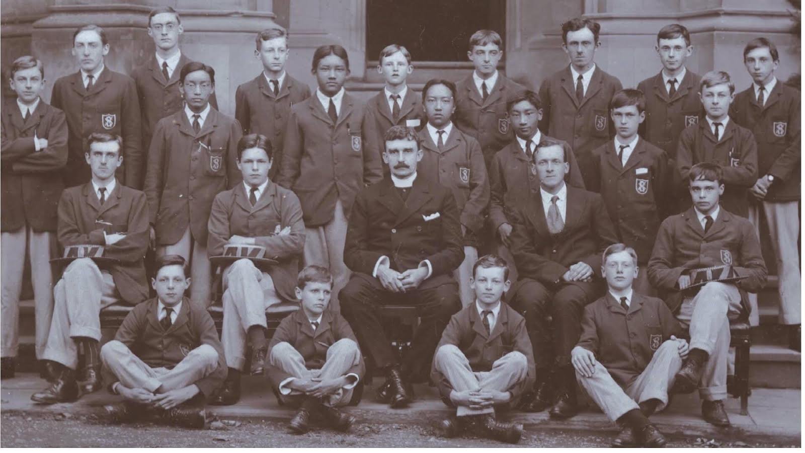 Four Tibetan boys joined the school. They were sent by the 13th Dalai Lama, who paid for their education with gold dust. Pictured behind the Head Master are; Kyipup, Ringang, Ghongkar, and Mondro. England 1913 ( known as Four Rugby Boys ) ས་གནས། དབྱིན་ཇིའི་རྒྱལ་ས་london ལོན་ཌོན་རག་པི་ Rugby schoo མཐོ་སློབ་ཁང་དུ་སློབ་མ་རྣམ་དང་མཉམ་པར། 1914 ༸རྒྱལ་དབང་སྐུ་ཕྲེང་བཅུ་གསུམ་པ་ཐུབ་བསྟན་རྒྱ་མཚོ་མཆོག་གིས་ཕྱི་ལོ་ 1913 ལོར་གཙང་རྟ་ནག་ལུང་ཤར་རྡོ་རྗེ་ཚེ་རྒྱལ་ལ་རིམ་བཞིའི་གོ་མིང་དང་འབྲེལ་བོད་རིགས་གཞོན་སྐྱེས་བཞིའི་སྣེ་འཁྲིད་གཏོང་སྐབས།