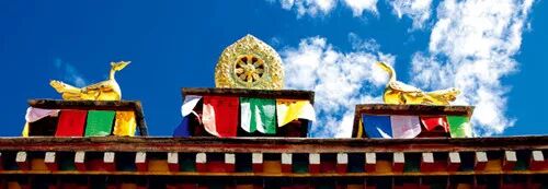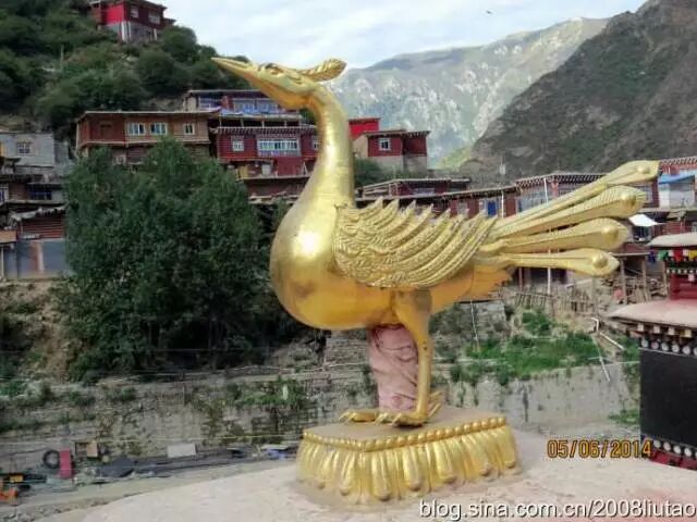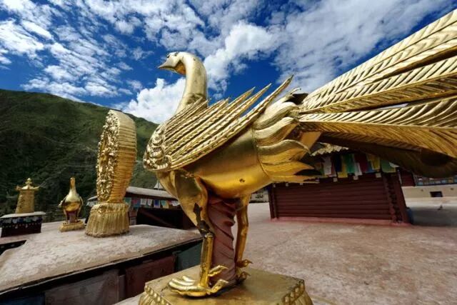 རྨ་བྱ་ཁ་སྤྲོད་གནས་པས་ནི། །ཐབས་ཤེས་ཟུང་དུ་འཇུག་པ་ཡི། ལམ་མཆོག་འཁྲུལ་མེད་ལ་བརྟེན་ནས། མཆོག་གི་དངོས་གྲུབ་ཐོབ་པར་མཚོན། །གཡས་གཡོན་རྨ་བྱ་ཟུང་གཅིག་གིས། གཉྫིའི་རྩེ་མོར་བལྟ་བས་ནི། །གྲུབ་མཐའ་འཛིན་པ་སུ་ཡིན་རུང་། །མཐར་ཐུག་བྱང་ཆེན་དམིགས་པར་མཚོན། །མདོ་སྨད་སྡེ་དགེའི་རྒྱལ་ཁབ་ཏུ། ཆོས་རྒྱལ་བསྟན་པ་ཚེ་རིང་གིས། པར་ཁང་ཆོས་མཛོད་ཆེན་མོ་དང་། །སྡེ་དགེའི་བླ་ཆེན་གྱིས་བཞེངས་པའི། བསམ་འགྲུབ་མཐོང་གྲོལ་ཆེན་མོ་རུ། །རྨ་བྱ་ཆོས་འཁོར་འཛུགས་པར་མཛད། །འདི་ཡི་མཚོན་དོན་གཞན་འདྲ་ལ། །ཆོས་ཀྱི་འཁོར་ལོའི་གྲུབ་ཆས་ནི། །ས་གསུམ་ཟླ་མེད་སྟོན་པ་དེས། །རིགས་གསུམ་གདུལ་བྱའི་ཚོགས་རྣམས་ལ། བསླབ་གསུམ་རིན་ཆེན་བརྗོད་བྱ་དང་། །སྡེ་གསུམ་རྗོད་བྱེད་བྱས་པ་ཡི། །ཐེག་གསུམ་ཆོས་འཁོར་བསྐོར་བར་མཚོན། །ས་དགོན་སྤྱི་ཡི་མཚོན་རྟགས་འདི། །ས་སྐྱའི་དགོན་ཆེན་ཙམ་མིན་པར། །ས་དགོན་གཞན་དང་གཞན་དག་ལའང་། །ས་ཁྱབ་རྡོ་ཁྱབ་འགྱུར་བར་སྨོན། ཚུལ་འདི་མང་པོས་བསྐུལ་བ་བཞིན། །རབ་བརྟན་དགེ་ལེགས་ཕུན་ཚོགས་པས། །མེ་བྱ་ནག་ཟླའི་ཚེས་བཅུ་ལ། །ལྷུན་འགྲུབ་སྟེང་ནས་འཕྲལ་བྲིས་དགེ །