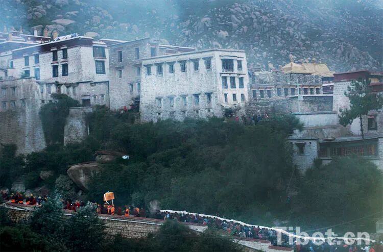 ལན་དུ། དུས་རབས་བཅོ་ལྔ་པའི་དུས་མཇུག་༡༤༩༣ཙམ་ལ་འབྲས་སྤུངས་དགོན་པའི་ནུབ་རིའི་ལྡེབས་སུ་གོས་ཐང་ཆེན་མོ་བཤམས་ཏེ་ཆོས་དད་མང་ཚོགས་རྣམས་ལ་མཇལ་ཁ་གཏོང་བའི་སྲོལ་དར་བ་ནས་བཟུང་ཞོ་སྟོན་འདི་ཉིད་མང་ཚོགས་རང་བཞིན་གྱི་དུས་སྟོན་གལ་ཆེན་ཞིག་ཏུ་འགྱུར་རོ།།