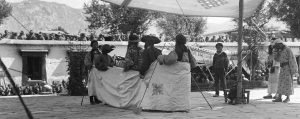 (དུང་དཀར་ཚིག་མཛོད་སོགས་ལས) དུས་རབས་བཅུ་བདུན་པ་སྟེ་ཏཱ་ལའི་བླ་མ་སྐུ་ཕྲེང་ལྔ་པའི་སྐབས་ནས་དར་བ་དང་བོད་ཟླ་དྲུག་པའི་གནམ་གང་སྟེ་ཞོ་སྟོན་གྱི་ཉིན་དེ་ལ་བོད་ཀྱི་བཀྲ་ཤིས་ཞོལ་པ་དང༌། བྲོ་པ། ཤེལ་རོང་འབྲོང་རྩེད་པ་བཅས་འབྲས་སྤུངས་སུ་ཡོང་ནས་དགའ་ལྡན་ཕོ་བྲང་གི་མདུན་ངོས་སུ་ཟློས་གར་དང་ལྷ་མོའི་འཁྲབ་སྟོན་གཟིགས་མོ་འབུལ་གྱི་ཡོད།