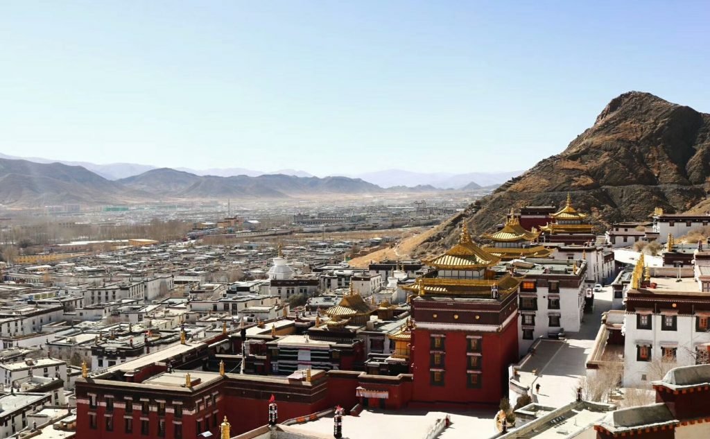 ཕྱི་ལོ་ ༡༦༠༠ ལོར་པཎ་ཆེན་སྐུ་ཕྲེང་བཞི་པ་བློ་བཟང་ཆོས་ཀྱི་རྒྱལ་མཚན་མཆོག་གིས་ཆོས་སྡེ་འདི་རྒྱས་སྐྲུན་མཛད་པ་ནས་བཟུང་པཎ་ཆེན་སྐུ་ཕྲེང་རིམ་བྱོན་གྱིས་ཉམས་གསོ་རྒྱས་སྐྲུན་གནང་སྟེ་དེང་གི་གཞི་ཁྱོན་འདི་ལྟ་བུ་བྱུང་ཤིང་། གསེར་འོད་ཆེམ་ཆེམ་དུ་འཕྲོ་བའི་གསེར་ཕིབས་དང་། རྒྱལ་མཚན། གཉྫིར་བཅས་ཀྱི་སྟེང་དུ་མཛེས་པའི་རྣམ་པ་ནི་བརྒྱ་བྱིན་རྣམ་པར་རྒྱལ་བའི་ཁང་བཟང་ཕྱོགས་འདིར་འཕོས་པ་ལྟ་བུའི་བརྗིད་ཉམས་དང་ལྡན་ལ། ལྟ་བས་ཆོག་མི་ཤེས་པ་ཞིག་དང་། གཞིས་རྩེ་གྲོང་ཁྱེར་གྱི་ཡུལ་ལྗོངས་ཀུན་ནས་མཛེས་པའི་རྒྱན་དུ་གྱུར་ཅིང་། གཞིས་རྩེའི་ནུབ་ངོས་ཉི་མ་གདོང་གི་རི་རྒྱུད་རྒྱབ་རི་གླང་ཆེན་འགྱིངས་པ་དང་འདྲ་བའི་ལྷོ་འདབས་སུ་རྔམ་བརྗིད་དང་ལྡན་པར་གནས་ཡོད།