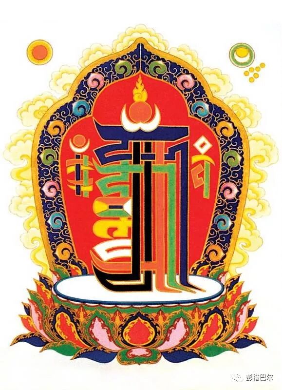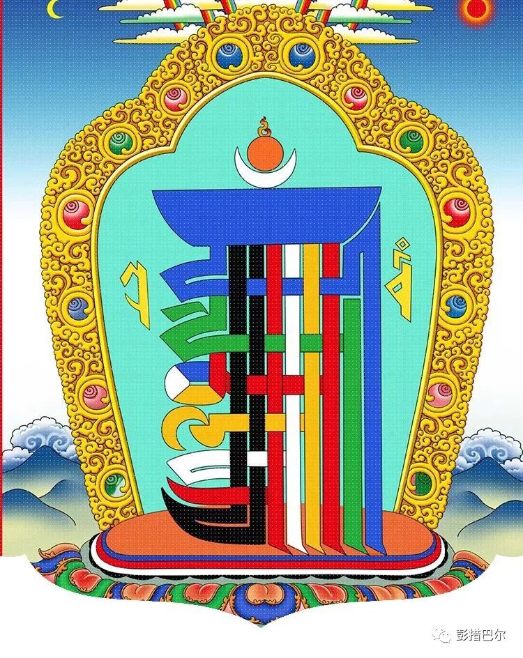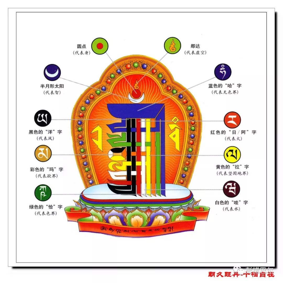 དེའི་ཚོན་མདོག་ནི། འོག་གི་འབྱུང་བ་རིམ་བརྩེགས་བཞི་ནི་སོ་སོའི་རང་མདོག་སྟེ། ཡ་ལྗང་ཁུ། ར་དམར་པོ། བ་དཀར་པོ། ལ་སེར་པོ། ནཱ་ད་ནམ་མཁའི་ཁམས་སྔོན་པོ་ཡིན། འདི་ནི་ཁམས་གསུམ་གྱི་འཇིག་རྟེན་སྣོད་བཅུད་ཐམས་ཅད་བསྡུས་པའམ་མཚོན་བྱེད་ཡིན་པས། འདི་ཁང་སྟེང་དུ་བཀལ་ན་ས་དཔྱད་ངན་པ་ཐམས་ཅད་ཟིལ་གྱིས་མནན་ནས་བཀྲ་ཤིས་པར་བྱེད། གཟའ་སྐར་ངན་པའི་གནོད་པ་ཐམས་ཅད་བཟློགས་ནས་གནོད་པ་སྲུང༌། ཁྱིམ་དུ་བཞག་ན་རྐྱེན་ངན་དང་བར་ཆད་སྲུང༌། དགེ་ཞིང་བཀྲ་ཤིས་པར་བྱེད་པ་སོགས་ཀྱི་ཕན་ཡོན་ཡོད་པར་བརྟེན། ཕལ་ཆེ་བས་ཁང་སྟེང་དང༌། གཙུག་ལག་ཁང་སོགས་ཀྱི་གྱང་ངོས་སུ་འབྲི་སྲོལ་ཆགས་ཡོད། དོན་དངོས་ཐོག་འདིས་ནི་དུས་ཀྱི་འཁོར་ལོ་ཕྱི་ནང་གཞན་གསུམ་མཐའ་དག་བསྡུས་ཡོད་པས་འདིར་ཆ་ཚང་བ་བཤད་མི་ནུས། ད་ལམ་འདིར་བྲིས་པའི་དགོས་དོན་ཡང་མཐོང་ཐོས་དྲན་པ་ཐམས་ཅད་གནས་སྐབས་བཀྲ་ཤིས་པར་བྱེད་པ་དང་། མཐར་ཐུག་དུས་ཀྱི་འཁོར་ལོའི་གོ་འཕང་མངོན་དུ་འགྱུར་བའི་ཆེད་དུ་ཡིན།