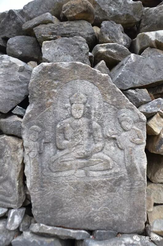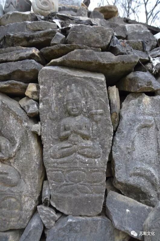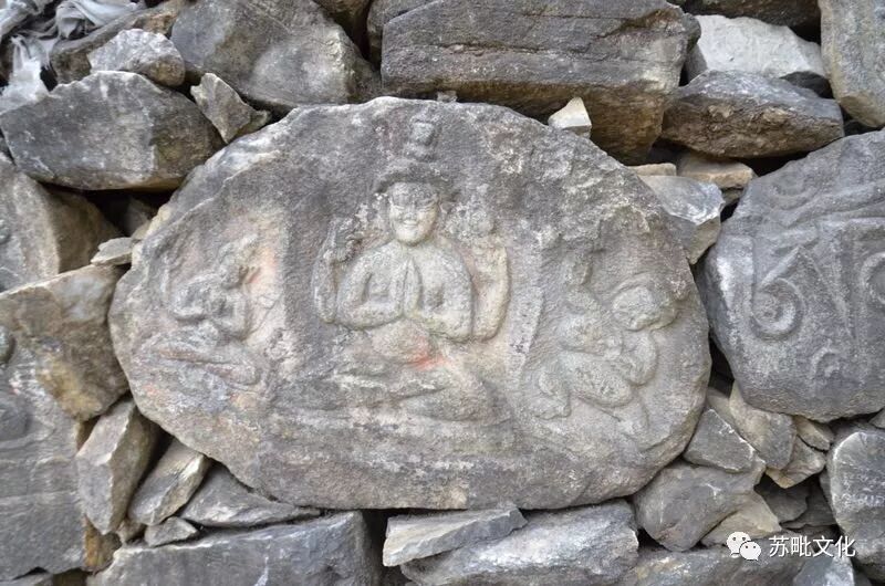 རྡོ་བརྐོས་ལྷ་སྐུ་ལ་སྤྱན་རས་གཟིགས་དང་། འཇམ་དཔལ་དབྱངས། ཕྱག་ན་རྡོ་རྗེ། སྨན་བླ། གུ་རུ། གཞན་སྤྱན་རས་གཟིགས་གཙོ་སྐུ་ཡིན་པའི་རིག་གསུམ་མགོན་པོ་དང་། གུ་རུ་གཙོ་འཁོར་གསུམ་རྣམས་རྡོ་གཅིག་གི་སྟེང་དུ་བརྐོས་པ་སོགས་རྡོ་སྐུ་རྙིང་པ་བཅུ་ཙམ་ཞིག་འདུག་ལ། དེའི་ཁྲོད་བྱུང་མང་བ་སྤྱན་རས་གཟིགས་ཀྱི་སྐུ་ཡིན་ཞིང་ད་ཡོད་རྡོ་སྐུ་ཁག་ལས་སྐུ་བཞི་ལྔ་ཞིག་སྤྱན་རས་གཟིགས་རེད་འདུག གསར་བཞེངས་མ་ཎི་རྡོ་རྩིག་ཅིག་གི་ཕྱོགས་སོ་སོའི་མཐའ་སྐོར་དུ་རྡོ་སྐུ་རྙིང་པ་རྣམས་བཞག་འདུག་ཅིང་། མ་ཎི་རྡོ་རྩིག་དེའི་ནང་ལོགས་སུ་ད་དུང་རྡོ་སྐུ་རྙིང་པ་དང་མ་ཎི་བརྐོས་མ་རྙིང་པ་ཡོད་ན་ཡང་ཅི་ཤེས། འདིར་ཡོད་པ་རྣམས་ནི་བཟོ་རྩལ་དང་རྣམ་པ་གང་ལ་བལྟས་ཀྱང་རྒྱ་གར་གྱི་ལུགས་ལྟར་བཞེངས་པ་སྟེ་ཤ་ཉམས་རྒྱགས་ཅིང་། གཙུག་ཏོར་ཟླུམ་ལ་མཐོ་བ། པད་གདན་མཐོ་ལ་ཆེ་བ། ཕྱག་མཚན་ཤིན་ཏུ་གསལ་བོ་དོད་ཅིང་ན་བཟའི་རི་མོ་ཤིན་ཏུ་གསལ་བ་ཤ་སྟག་རེད། དེ་ལས་འཇམ་དབྱངས་ཀྱི་ཕྱག་གཉིས་ཆོས་འཆད་ཕྱག་རྒྱ་ལྟར་དུ་གནས་ཤིང་། གཡས་གཡོན་གྱི་པདྨའི་འདབ་མའི་སྟེང་སུ་གཡས་སུ་རལ་གྲི་དང་། གཡོན་དུ་པི་ཏི་ཡོད་པ་ཞིག་དང་། སྤྱན་རས་གཟིགས་ཀྱི་དབུའི་གཙུག་དོར་མཐོ་ལ་དེར་དབུ་རྒྱན་ལེགས་པར་བརྒྱན་པ་སྐུ་གཅིག་གཉིས་ཤིག་ལ་དབུ་སྟེང་དུ་ཨ་མུ་དྷེ་ཝའི་སྐུ་དང་། དབུ་སྐྲ་ལྕང་ལོ་ལྟར་གནས་ཤིང་། མནབས་བཟའ་དར་ཟབ་ལྟ་བུའི་བརྒྱན་པ་སོགས་རྒྱན་ཆ་ལུགས་རྫོགས་པ་ཞིག་ཏུ་འདུག གུ་རུ་གཙོ་འཁོར་གསུམ་ལས་གཙོ་སྐུ་གུ་རུ་ནི་ཞབས་དཀྱིལ་དྲུང་གིས་བཞུགས་ཤིང་དབུར་པད་ཞྭ་མནབས་པ། དབུ་སྐྲ་ལྟག་རྒྱབ་ཏུ་གཟར་བ། སྙན་ཐད་སོར་རྒྱ་ཆེ་ཞིང་། དེའི་སྣེར་སྙན་རྒྱན་བཏགས་པ། ཕྱག་གཡས་རྡོ་རྗེ་དང་གཡོན་ཀ་པ་ལ་བསྣམས་པ། གཡས་ཀྱི་ལྷ་མོའི་ཕྱག་གཡོན་དང་། གཡོན་པས་ཕྱག་གཡས་ཀྱིས་མཆོད་པ་འབུལ་བའི་རྣམ་པར་ཡོད་པ་ཞིག་ཏུ་འདུག གཡས་སུ་ཡོད་པ་དེ་ལྷ་ལྕམ་མནྡ་ར་བ་དང་། གཡོན་མཁའ་འགྲོ་ཡེ་ཤེས་མཚོ་རྒྱལ་ཡིན་པར་སྤྱི་ལུགས་ལྟར་ཚོད་འཇོག་བྱས། རྡོ་སྐུ་གཞན་རྣམས་ནི་སྤྱི་ཁྱབ་ལྟར་ལགས། རྡོ་སྐུ་དག་གི་ཆེ་ཆུང་ཚད་ནི། ཕལ་ཆེར་སྲིད་དུ་ལི་སྨི་50ནས་60ཙམ་དང་། ཞེང་ཚད་ལ་ལི་སྨི་30ནས་40ཡས་མས་ཙམ་ཡོད་འདུག་ལ། རིག་གསུམ་མགོན་པོའི་སྐུ་དང་། གུ་རུ་གཙོ་འཁོར་གྱི་སྐུ་གཉིས་ཞེང་དེ་ལས་ཆེ་ཙམ་འདུག