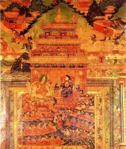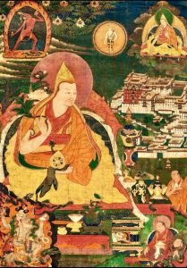 བོད་གངས་ཅན་ལྷ་གཅིག་སྤྱན་རས་གཟིགས། །ཁྲིམས་སྡོམ་བརྩོན་རྒྱལ་བའི་ཚུལ་འཆང་བ། །མགོན་ཀུན་གཟིགས་ལྔ་པ་ཆེན་མོ་ཞེས། །མཚན་ཉི་ཟླ་ལྟ་བུར་གྲགས་པ་དེ། །ཡུལ་གཡང་ཆགས་ཡར་ཀླུང་ནུབ་ཀྱི་ཆ། །རྫོང་ཕྱིང་བ་སྟག་རྩེའི་ཕོ་བྲང་དུ། །ཡབ་ཟ་ཧོར་བདུད་འདུལ་རབ་བརྟན་དང་། །ཡུམ་ཁྲི་ལྕམ་ཀུན་དགའ་ལྷ་མཛེས་ལས། །ལོ་མེ་སྦྲུལ་ཧོར་ཟླ་དགུ་པ་ཡི། །ཚེས་ཉེར་གསུམ་སྤེན་རྒྱལ་འཛོམས་པའི་ཉིན། །མདོག་རབ་མཛེས་སྐུ་ཡི་མེ་ཏོག་བཞད། །