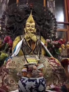དེ་ལྟར་རྗེ་རིན་པོ་ཆེའི་དྲུང་དུ་དམ་བཅས་པ་མཐར་ཕྱིན་པར་མཛད་དེ་རྒྱུད་ཀྱི་འཆད་ཉན་སྦྱིན་པ་དཔལ་བ་ལ་གཏད་དེ་དགུང་ལོ་རེ་གསུམ་ཤིང་གླང་ (༡༤༤༥) ལོའི་བོད་ཟླ་ལྔ་པའི་ཚེས་ཉེར་ལྔ་ལ་དགའ་ལྡན་རྒྱུད་ཁང་དུ་བདེ་བར་གཤེགས་སུ་ཕུལ་བའི་དབུ་ཐོད་མ་ཉམས་པ་དང་། རིང་བསྲེལ་ངོ་མཚར་བ་རང་བྱོན་དུ་ཕེབས་པ་རྗེ་དགེ་འདུན་གྲུབ་པ་བཞེས་ཏེ་ད་ལྟའི་ཐུབ་དབང་བདུད་འདུལ་མའི་གཟུངས་སུ་བཞུགས།